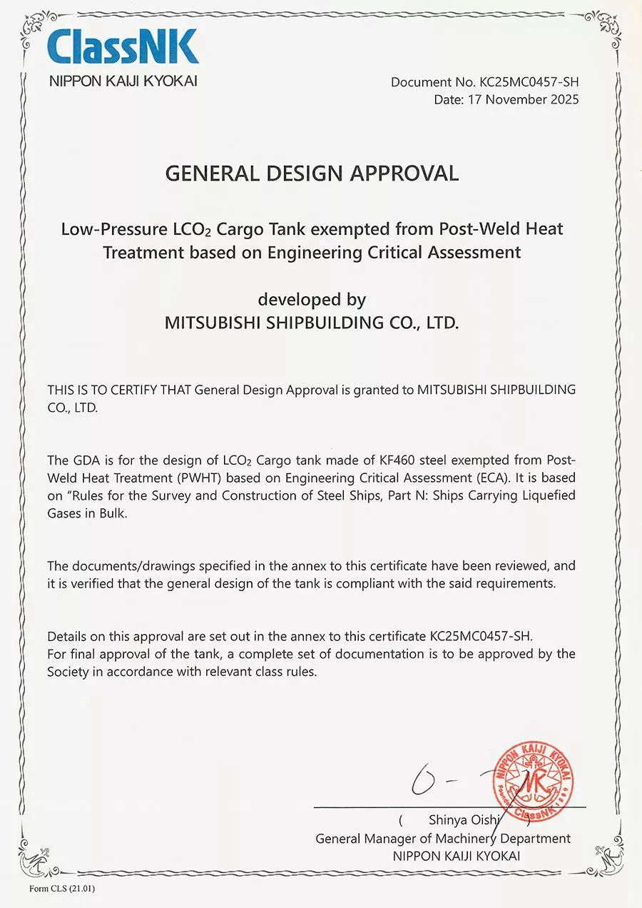 The acquisition of this GDA represents a remarkable breakthrough achieved by the technical cooperation between the two companies, and it will contribute greatly to reducing LCO2 transportation costs by ensuring the safety of low-pressure LCO2 tanks while delivering both economic viability and productivity. Mitsubishi Shipbuilding and Nippon Steel will build on this joint success and work with supply-chain partners involved in LCO2 tank manufacturing to commercialize the developed steel and low-pressure LCO2 tanks.